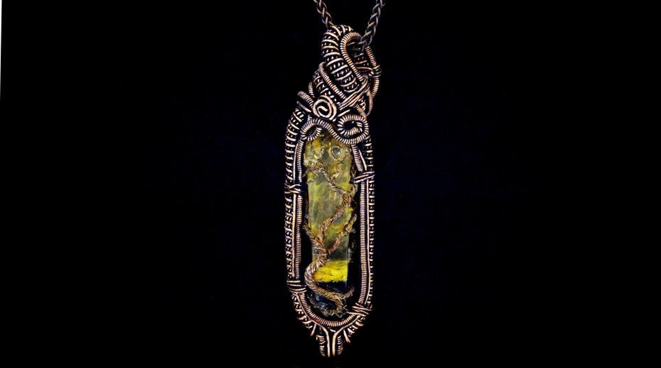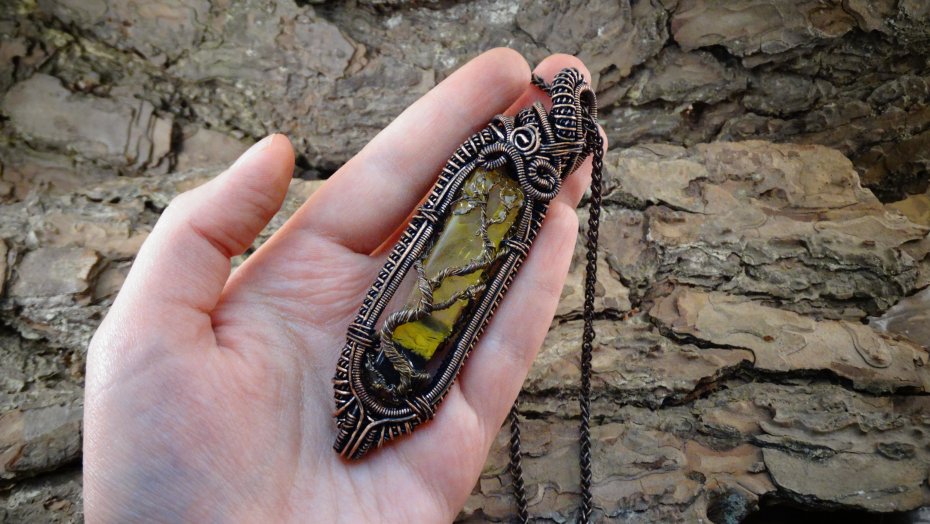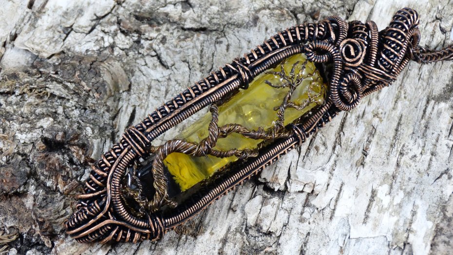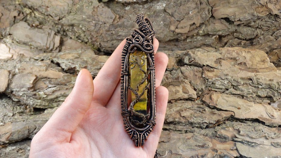 Miedziany wisiorek oksydowany wykonany techniką Wire Wrapping z autorskim kamieniem z żywicy epoksydowej z drzewem życia