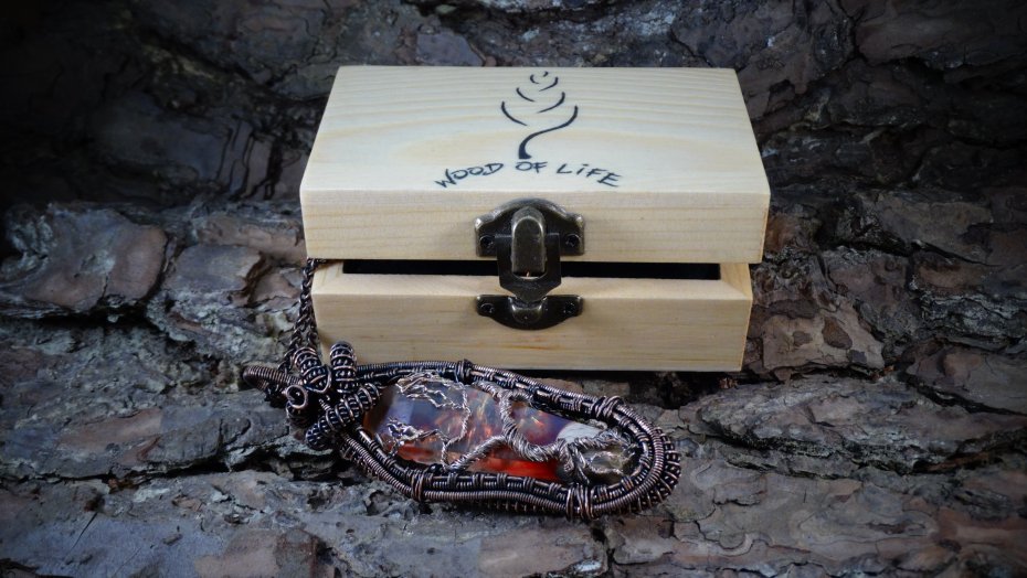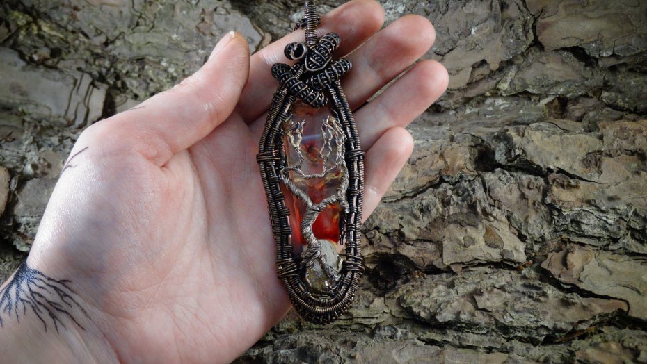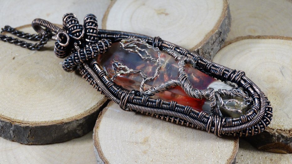 Miedziany wisiorek oksydowany wykonany techniką Wire Wrapping z autorskim kamieniem z żywicy epoksydowej i drewna z drzewem życia
