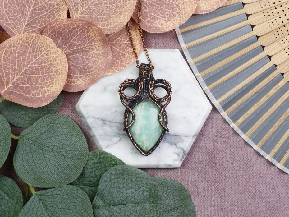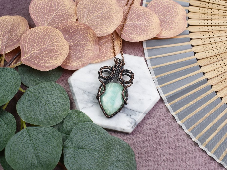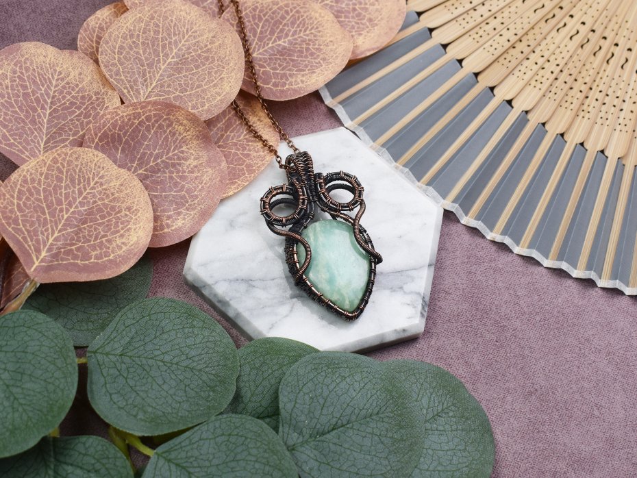 Miedziany wisiorek wykonany metodą wire wrapping to unikalna biżuteria, która zachwyca prostotą i oryginalnością. Jego sercem jest piękny kamień, amazonit, który dzięki misternemu opleceniu drutem nabiera wyjątkowego charakteru. Kamień ten, znany również jako mikroklin, emanuje spokojem i równowagą, co sprawia, że wisiorek nie tylko ozdabia, ale także niesie ze sobą pozytywne energie. To niepowtarzalne dzieło rękodzielnicze doskonale podkreśli Twoją indywidualność, dodając subtelnego blasku i natury do Twojego codziennego stylu.