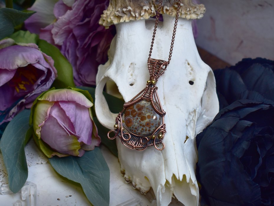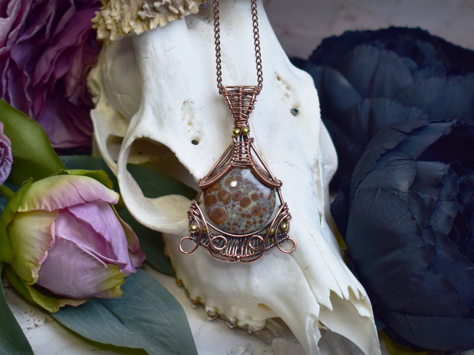 Miedziany wisiorek wykonany techniką wire wrapping, ozdobiony jaspisem Asteroid – kamieniem o surowym, kosmicznym charakterze i nieregularnych wzorach w ziemistych odcieniach brązu, szarości i grafitu. Jaspis ten kojarzony jest z ugruntowaniem, odpornością i wewnętrzną stabilnością. Sprzyja koncentracji, pomaga zachować spokój w wymagających sytuacjach oraz wzmacnia poczucie bezpieczeństwa i siły. Połączenie naturalnej, nieco pierwotnej estetyki kamienia z ręcznie formowanym miedzianym oplataniem tworzy wyrazistą, a jednocześnie harmonijną kompozycję, podkreślającą unikatowy charakter minerału. Wisiorek doskonale sprawdzi się jako amulet dla osób ceniących surowe piękno natury, rękodzieło i biżuterię z charakterem.