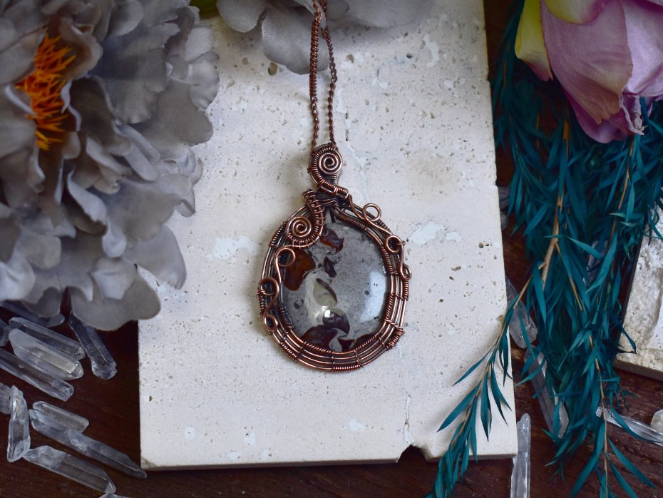 Miedziany wisiorek wykonany techniką wire wrapping, ozdobiony jaspisem Coffee Bean – kamieniem o charakterystycznym wzorze przypominającym ziarna kawy, w ciepłych odcieniach brązu, beżu i kremu. Jaspis ten uznawany jest za kamień stabilizacji i ugruntowania, wspierający poczucie bezpieczeństwa, wytrwałość oraz wewnętrzny spokój. Pomaga zachować równowagę emocjonalną, wzmacnia cierpliwość i sprzyja harmonijnemu podejściu do codziennych wyzwań. Połączenie naturalnej struktury kamienia z ręcznie formowanym miedzianym oplataniem tworzy spójną, organiczną kompozycję, podkreślającą surowe piękno minerału. Wisiorek doskonale sprawdzi się jako wyjątkowy amulet dla osób ceniących rękodzieło, naturalne materiały i niepowtarzalny charakter biżuterii.