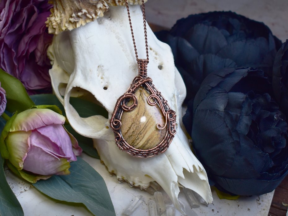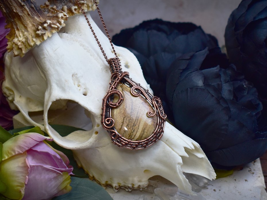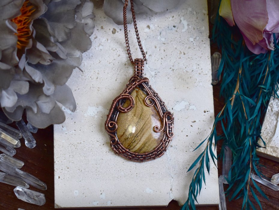 Miedziany wisiorek wykonany techniką wire wrapping, ozdobiony jaspisem obrazkowym (Picture Jasper) o naturalnym, krajobrazowym wzorze w ciepłych odcieniach brązu, beżu i piasku. Kamień ten ceniony jest za swoje właściwości ugruntowujące oraz zdolność do przywracania wewnętrznej równowagi i spokoju. Sprzyja połączeniu z naturą, pomaga wyciszyć umysł i odnaleźć harmonię w codziennym życiu. Połączenie surowego piękna kamienia z ręcznie formowanym miedzianym oplataniem tworzy spójną, organiczną kompozycję, podkreślającą naturalny charakter biżuterii. Wisiorek doskonale sprawdzi się jako wyjątkowy amulet dla osób ceniących naturę, ziemiste barwy i ręcznie wykonaną biżuterię.