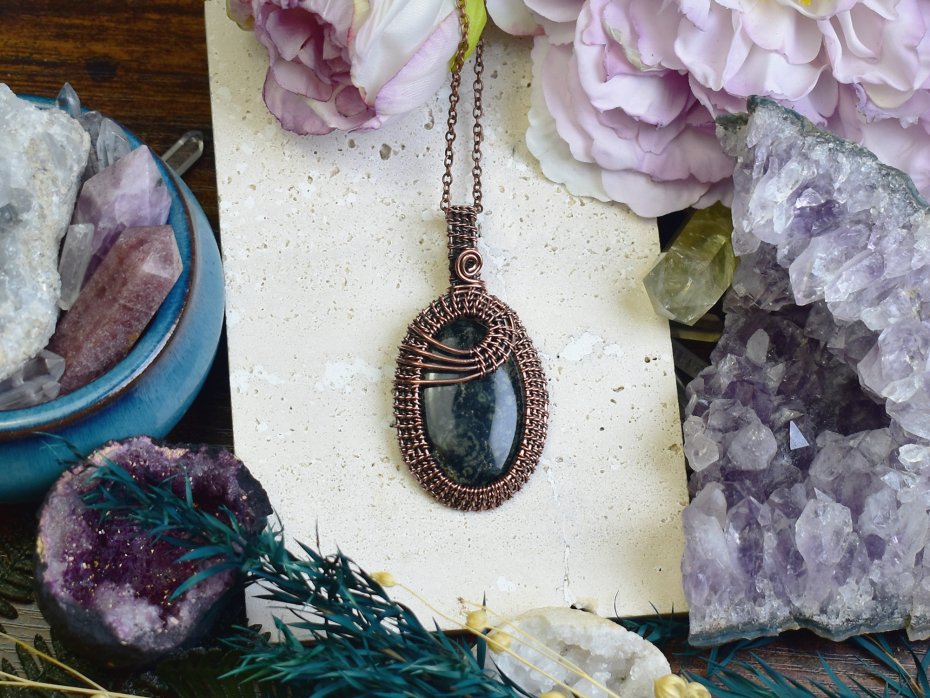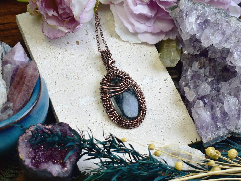 Miedziany wisiorek wykonany w technice wire wrapping, zdobiony jaspisem Star Galaxy o głębokiej, ciemnej barwie z subtelnymi, złocistymi refleksami. Jaspis od wieków kojarzony jest z wewnętrzną siłą, stabilnością i ochroną. Wisiorek łączy surowy urok kamienia z precyzyjnym ręcznym oplataniem, tworząc unikalny amulet dodający pewności siebie i harmonii.
