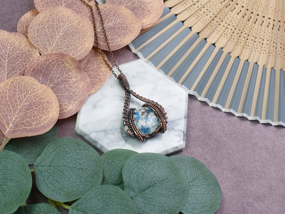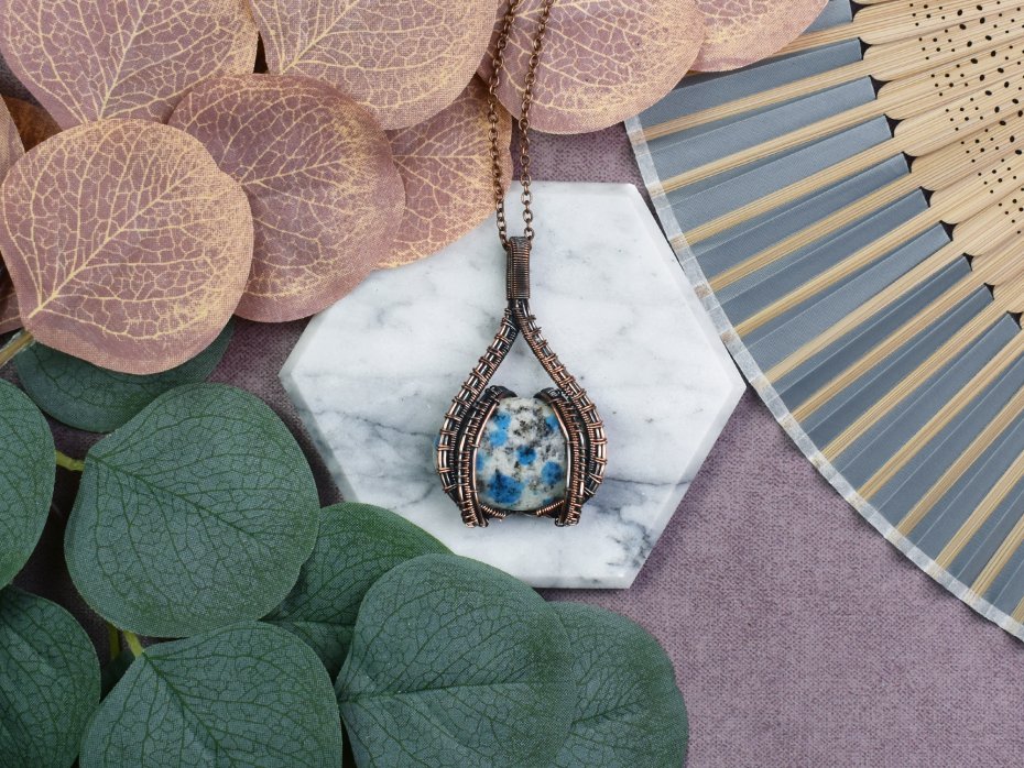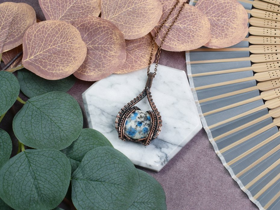Wisiorek wykonany w technice wire wrapping z kamieniem K2 to unikalna biżuteria, która zachwyca nie tylko swoim designem, ale także niezwykłymi właściwościami kamienia. K2 to minerał składający się z granitu i azurytu, charakteryzujący się pięknymi, niebiesko-białymi plamami na białym tle. Kamień ten jest ceniony za swoje właściwości energetyczne, wspierające klarowność myśli i umożliwiające osiągnięcie wewnętrznego spokoju. Wisiorek jest starannie wykonany z misternie splecionego drutu, podkreślając naturalne piękno kamienia K2, co sprawia, że jest nie tylko ozdobą, ale także amuletem harmonii i jasności.