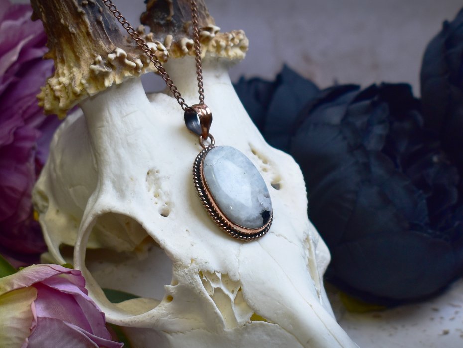 Miedziany wisiorek wykonany tradycyjnymi metodami rzemieślniczymi, ozdobiony kamieniem księżycowym o subtelnych, opalizujących odcieniach bieli i kremu. Kamień księżycowy od wieków kojarzony jest z intuicją, wewnętrzną równowagą i łagodną, kobiecą energią. Jego delikatny blask pięknie kontrastuje z ciepłym odcieniem miedzi, tworząc elegancką i harmonijną kompozycję. Wisiorek łączy klasyczną formę z naturalnym pięknem minerału, nadając biżuterii ponadczasowy charakter. To wyjątkowy wybór dla osób ceniących rękodzieło, tradycyjne rzemiosło oraz biżuterię o symbolicznym znaczeniu i subtelnej, mistycznej aurze.