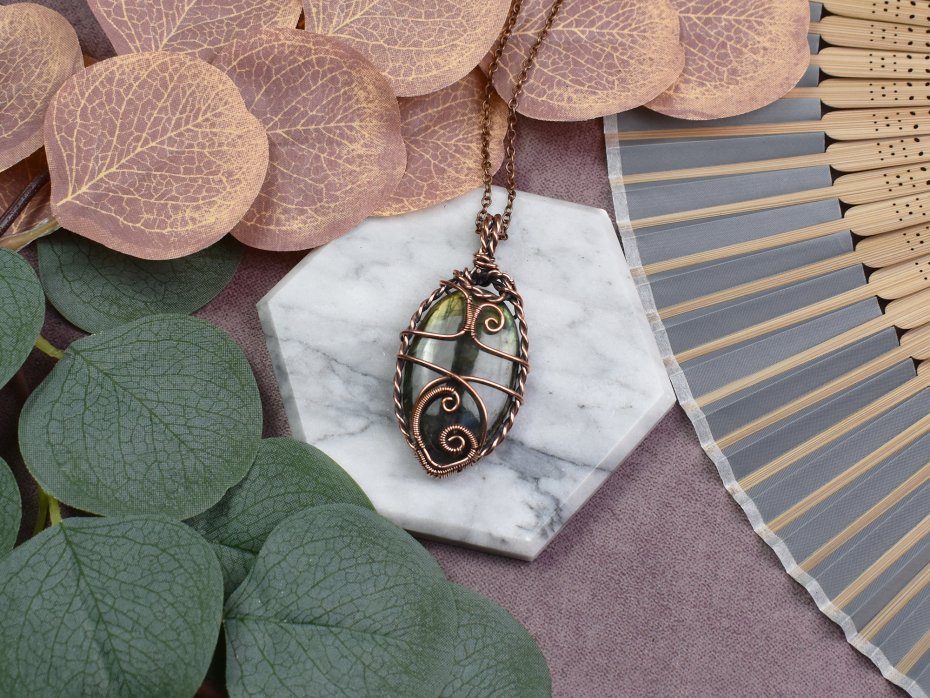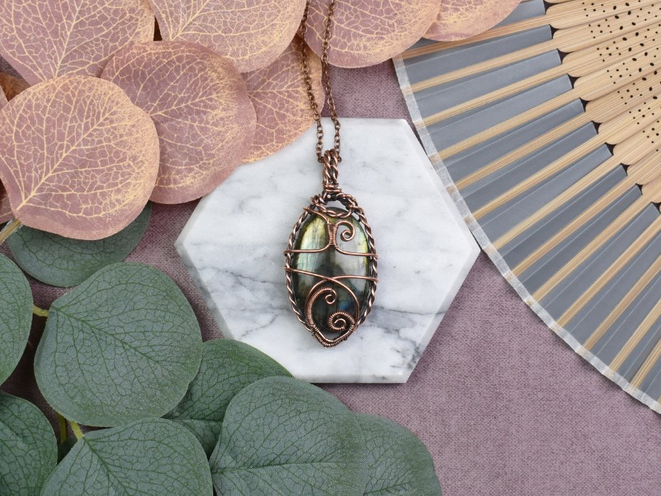 Piękny wisiorek wykonany metodą wire wrapping z miedzią, ozdobiony mistycznym labradorytem. Kamień ten, znany również jako labradoryt, emanuje subtelnością odcieni niebieskiego i złota, nadając wisiorkowi wyjątkowy urok. Jego właściwości obejmują wzmacnianie intuicji, rozwijanie kreatywności oraz przynoszenie spokoju emocjonalnego. Noszenie tego wisiorka może być nie tylko modowym akcentem, ale także sposobem na zharmonizowanie energii i odczuwanie równowagi. To niezwykłe połączenie miedzi i labradorytu tworzy niepowtarzalny amulet, który przyciąga pozytywne wibracje i podkreśla unikalność noszącego.