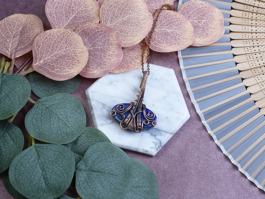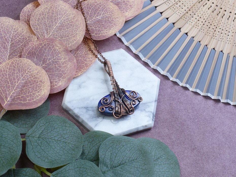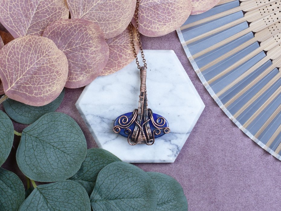 Miedziany wisiorek z kamieniem lapis lazuli wykonany techniką wire wrapping to prostota w pięknej formie. Delikatnie ręcznie splecione druty miedziane obejmują głęboko niebieski kamień, nadając mu wyjątkowy charakter. Lapis lazuli, znany ze swojego bogactwa kolorów i głębokiego znaczenia historycznego, dodaje wisiorkowi elegancji i tajemniczości. To nie tylko biżuteria, ale również mały kawałek sztuki, który przyciąga uwagę swoją naturalną prostotą i urodą. Nosząc ten wisiorek, niesiesz ze sobą nie tylko piękno kamienia, ale także ręcznej pracy artysty, co czyni go wyjątkowym dodatkiem do każdej stylizacji.