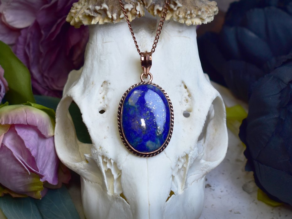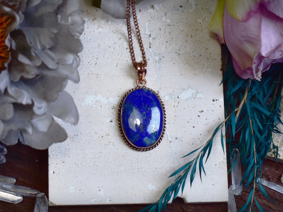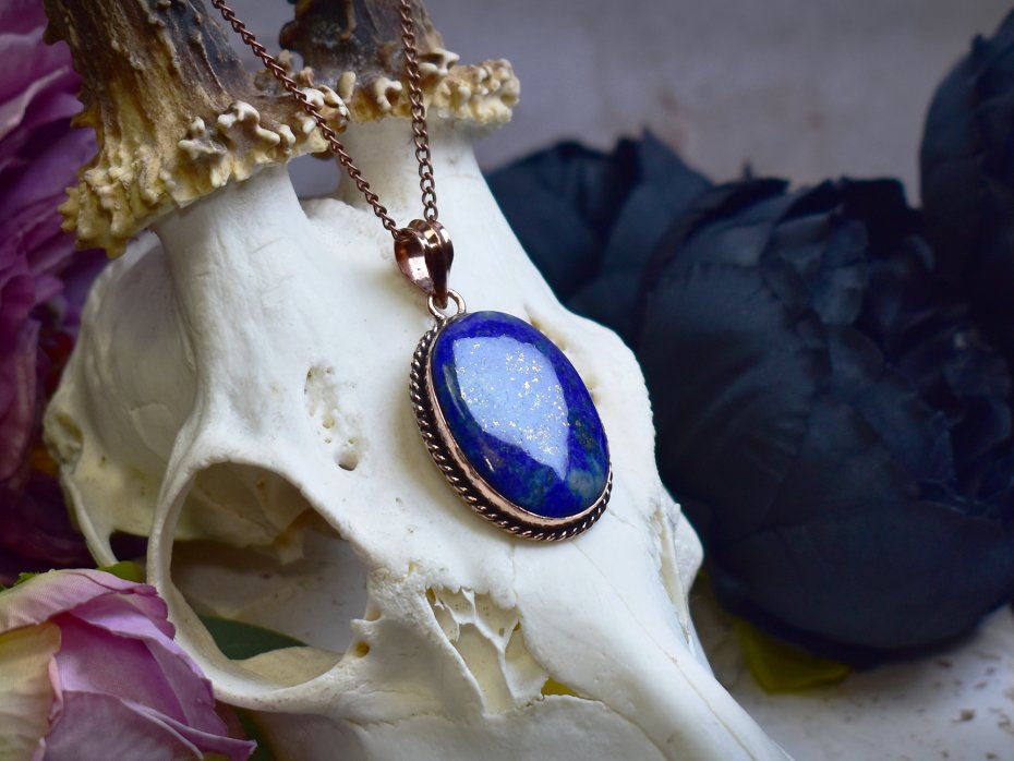 Miedziany wisiorek wykonany tradycyjnymi metodami rzemieślniczymi, ozdobiony lapisem lazuli – kamieniem o intensywnej, głębokiej barwie niebieskiej, często przeplatanej naturalnymi złotymi inkluzjami pirytu. Klasyczna forma i ręczne wykończenie podkreślają szlachetny charakter biżuterii oraz ponadczasowe piękno minerału. Lapis lazuli od wieków kojarzony jest z mądrością, prawdą i wewnętrzną harmonią, sprzyja jasności myśli oraz pogłębianiu intuicji. Ciepły odcień miedzi tworzy wyrazisty kontrast z chłodnym błękitem kamienia, nadając wisiorkowi elegancki, a jednocześnie naturalny wygląd. To wyjątkowy wybór dla osób ceniących rękodzieło, tradycyjne rzemiosło i biżuterię o symbolicznym znaczeniu.