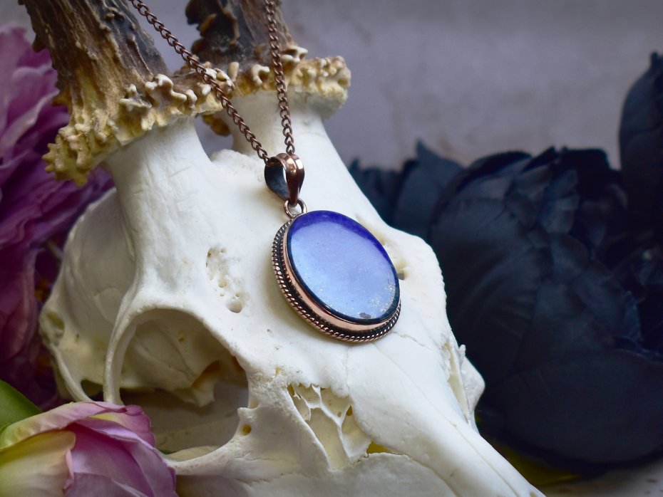 Miedziany wisiorek wykonany tradycyjnymi metodami rzemieślniczymi, ozdobiony lapisem lazuli – kamieniem o intensywnej, głębokiej barwie niebieskiej, często przeplatanej naturalnymi złotymi inkluzjami pirytu. Klasyczna forma i ręczne wykończenie podkreślają szlachetny charakter biżuterii oraz ponadczasowe piękno minerału. Lapis lazuli od wieków kojarzony jest z mądrością, prawdą i wewnętrzną harmonią, sprzyja jasności myśli oraz pogłębianiu intuicji. Ciepły odcień miedzi tworzy wyrazisty kontrast z chłodnym błękitem kamienia, nadając wisiorkowi elegancki, a jednocześnie naturalny wygląd. To wyjątkowy wybór dla osób ceniących rękodzieło, tradycyjne rzemiosło i biżuterię o symbolicznym znaczeniu.