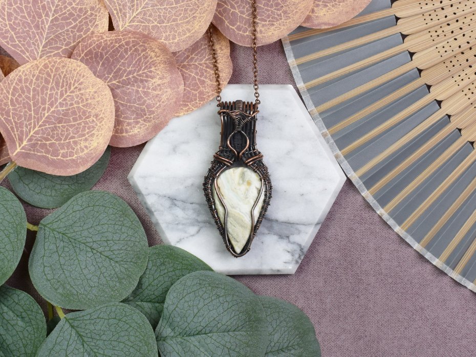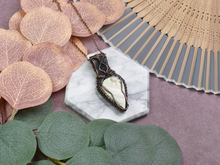 Miedziany wisiorek wykonany techniką wire wrapping z kamieniem larsonitem to niezwykłe połączenie naturalnej elegancji i ręcznej precyzji. Larsonit, znany również jako "kamień deszczu", zachwyca swoim unikalnym wzorem, który przypomina delikatne chmury na tle nieba. Ten kamień symbolizuje spokój, ochronę i równowagę, pomagając noszącemu w osiągnięciu wewnętrznego spokoju i klarowności myśli. Dodając temu wisiorkowi, wykonanemu z dbałością o szczegóły, osobisty akcent, możesz cieszyć się nie tylko jego estetyką, ale także pozytywnym wpływem larsonitu na Twoje życie.