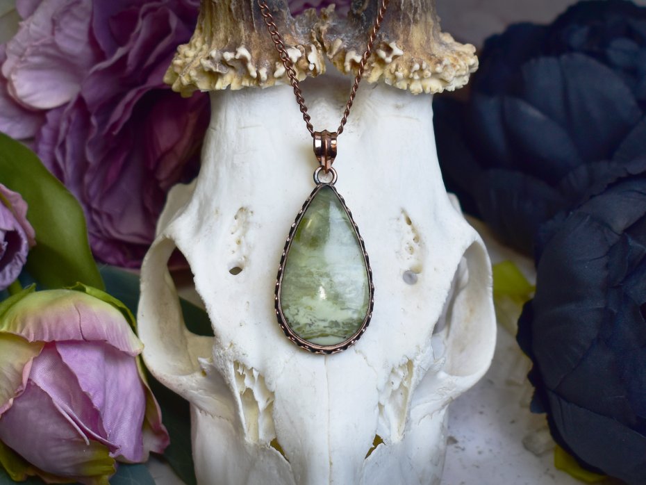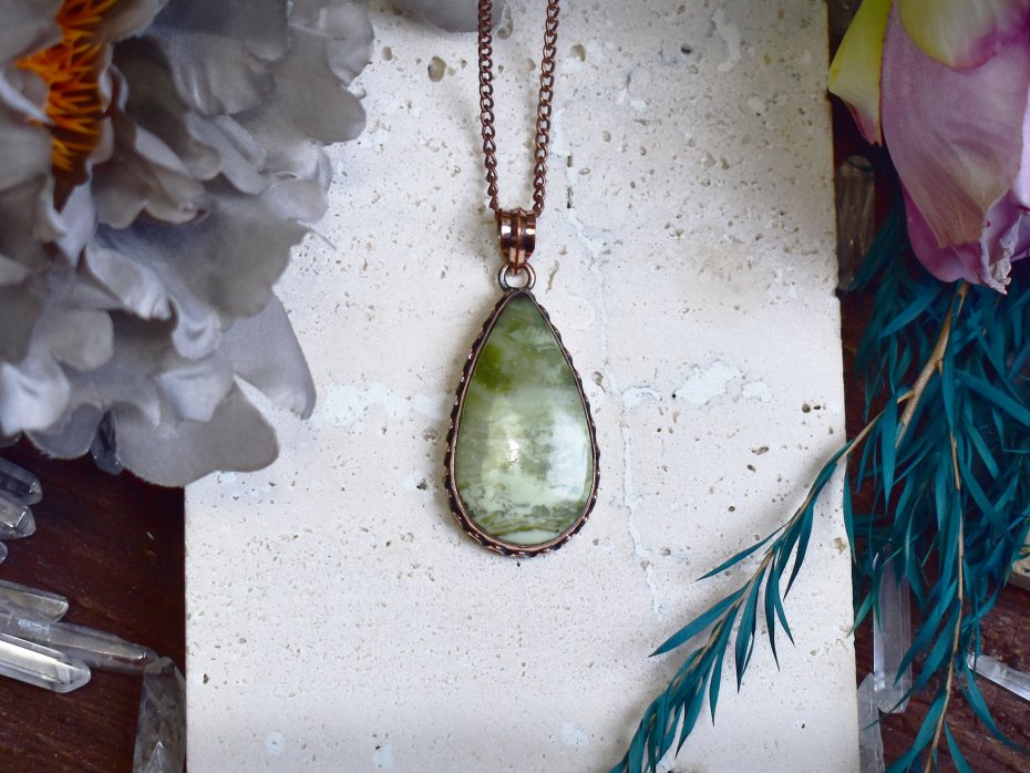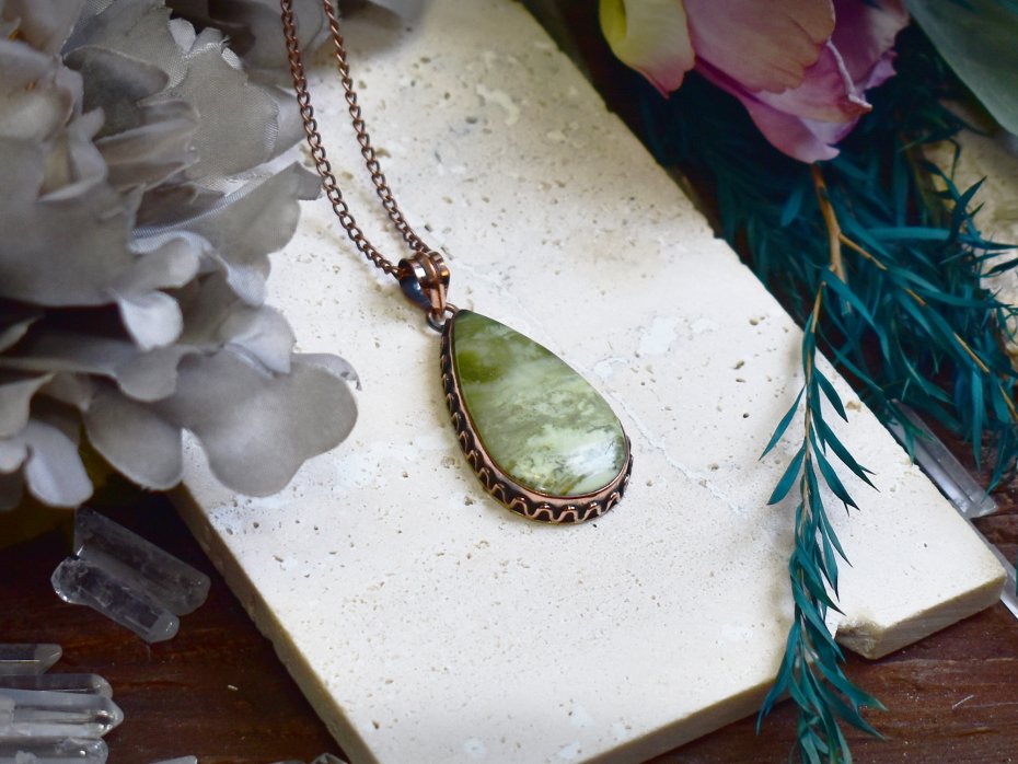 Miedziany wisiorek wykonany tradycyjnymi metodami rzemieślniczymi, ozdobiony larsonitem – kamieniem o jasnych, kremowo-białych odcieniach z delikatnymi, naturalnymi żyłkami. Klasyczna forma i ręczne wykończenie podkreślają autentyczny charakter biżuterii oraz naturalne piękno minerału. Larsonit kojarzony jest z równowagą, cierpliwością i wyciszeniem, sprzyja koncentracji oraz wewnętrznemu spokojowi. Ciepły odcień miedzi harmonijnie współgra z subtelną kolorystyką kamienia, tworząc spokojną, elegancką kompozycję. Wisiorek będzie doskonałym wyborem dla osób ceniących rękodzieło, tradycyjne rzemiosło i biżuterię inspirowaną naturą.