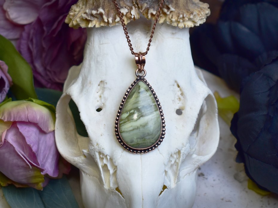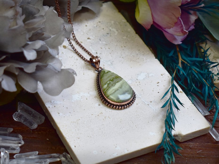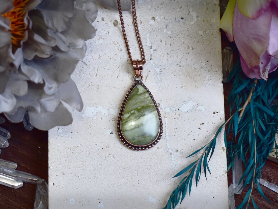 Miedziany wisiorek wykonany tradycyjnymi metodami rzemieślniczymi, ozdobiony larsonitem – kamieniem o jasnych, kremowo-białych odcieniach z delikatnymi, naturalnymi żyłkami. Klasyczna forma i ręczne wykończenie podkreślają autentyczny charakter biżuterii oraz naturalne piękno minerału. Larsonit kojarzony jest z równowagą, cierpliwością i wyciszeniem, sprzyja koncentracji oraz wewnętrznemu spokojowi. Ciepły odcień miedzi harmonijnie współgra z subtelną kolorystyką kamienia, tworząc spokojną, elegancką kompozycję. Wisiorek będzie doskonałym wyborem dla osób ceniących rękodzieło, tradycyjne rzemiosło i biżuterię inspirowaną naturą.