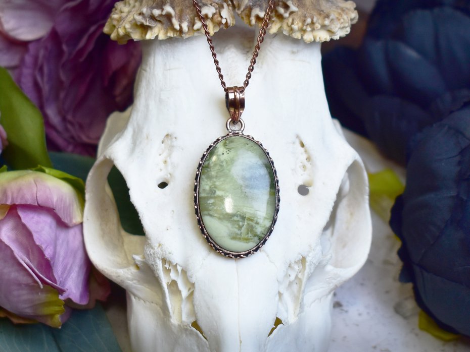 Miedziany wisiorek wykonany tradycyjnymi metodami rzemieślniczymi, ozdobiony larsonitem – kamieniem o jasnych, kremowo-białych odcieniach z delikatnymi, naturalnymi żyłkami. Klasyczna forma i ręczne wykończenie podkreślają autentyczny charakter biżuterii oraz naturalne piękno minerału. Larsonit kojarzony jest z równowagą, cierpliwością i wyciszeniem, sprzyja koncentracji oraz wewnętrznemu spokojowi. Ciepły odcień miedzi harmonijnie współgra z subtelną kolorystyką kamienia, tworząc spokojną, elegancką kompozycję. Wisiorek będzie doskonałym wyborem dla osób ceniących rękodzieło, tradycyjne rzemiosło i biżuterię inspirowaną naturą.