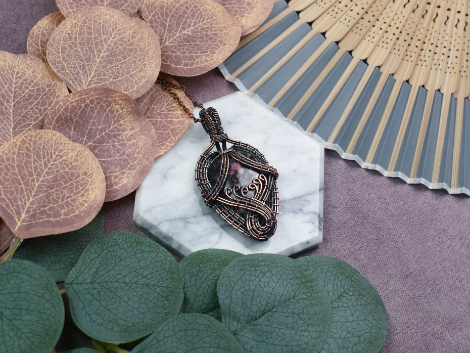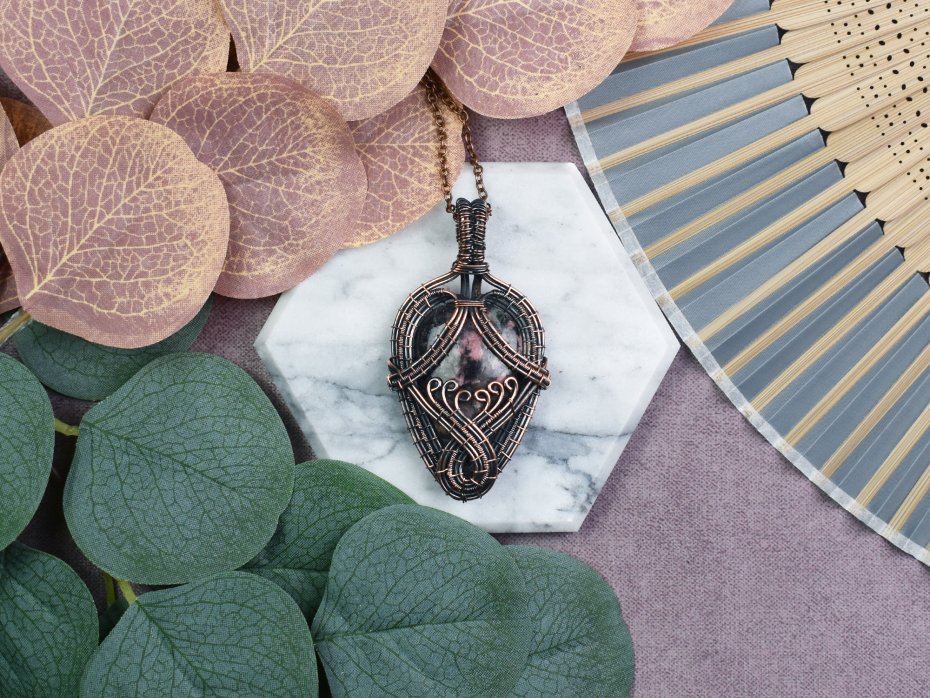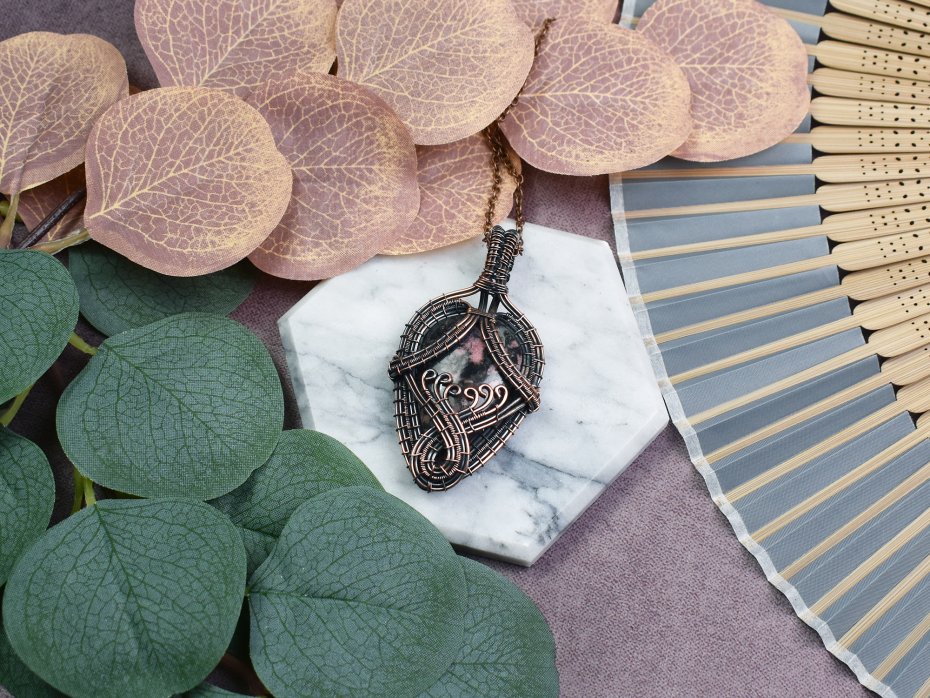 Miedziany wisiorek opleciony techniką wire wrapping, ozdobiony urokliwym kamieniem – rodonitem. Ten niezwykły wisiorek emanuje delikatnym pięknem i unikalnością. Kamień ten, znany również jako różowy różanecznik, dodaje subtelności i harmonii całej kompozycji. To doskonała biżuteria dla tych, którzy pragną nosić ze sobą nie tylko elegancję miedzi, ale także piękno naturalnych kamieni.