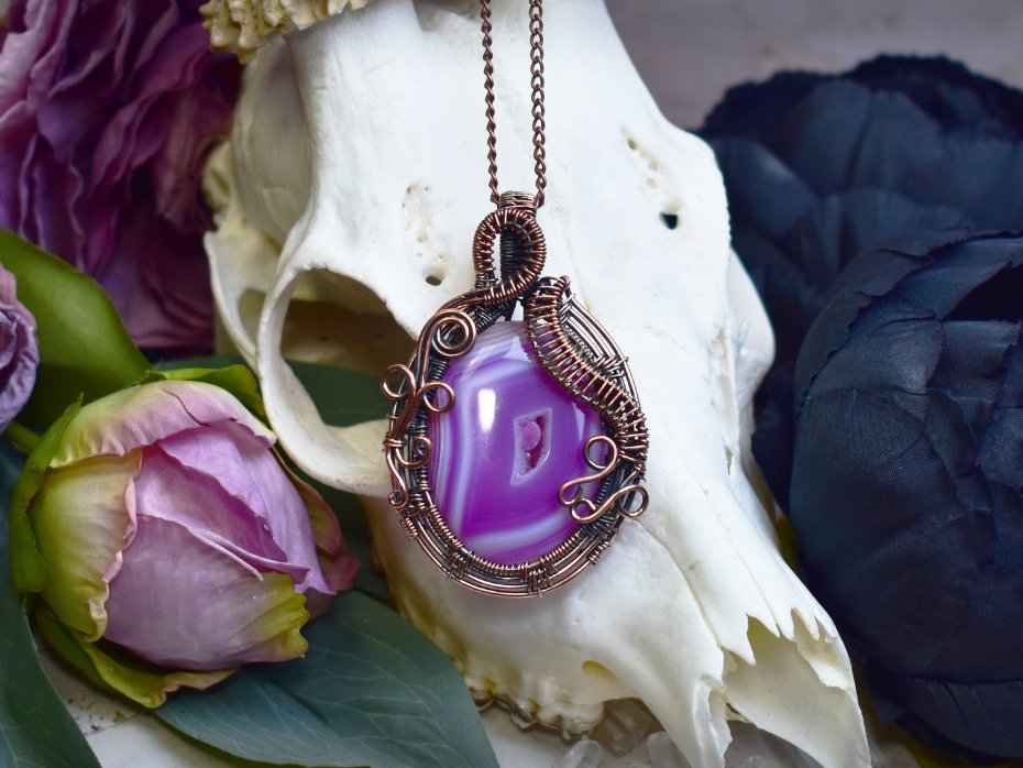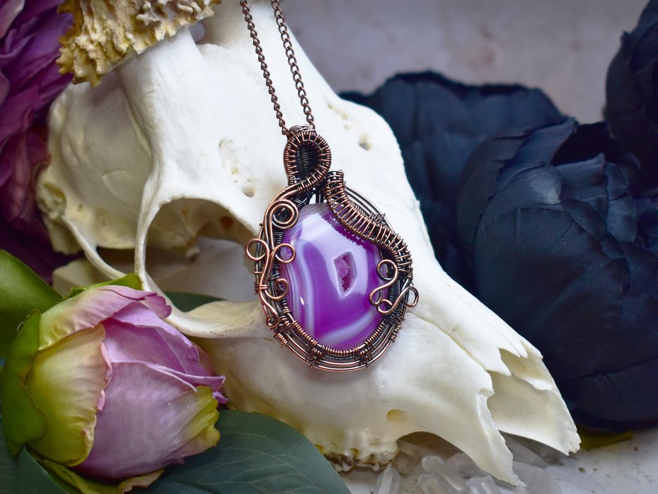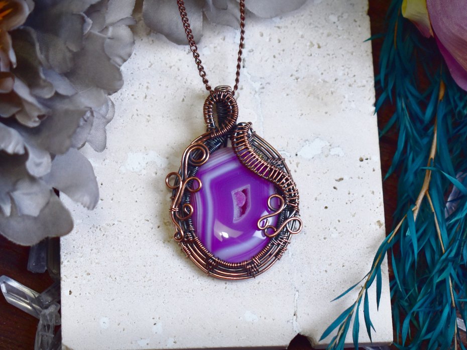 Miedziany wisiorek wykonany techniką wire wrapping, ozdobiony różowym agatem z delikatną, naturalną drużą. Kamień przyciąga łagodną, kojącą energię, sprzyja otwartości serca, wewnętrznemu spokoju i harmonii emocjonalnej. Druza dodaje mu subtelnego blasku i podkreśla unikatowy charakter minerału, wprowadzając element naturalnej magii i energii kryształów. Połączenie miękkiego odcienia różu z misternym, ręcznie formowanym miedzianym oplataniem tworzy elegancką, organiczną kompozycję, która wyróżnia się swoim naturalnym pięknem. Wisiorek sprawdzi się jako wyjątkowy amulet dla osób ceniących rękodzieło, unikatowe wzory i biżuterię o symbolicznym znaczeniu.