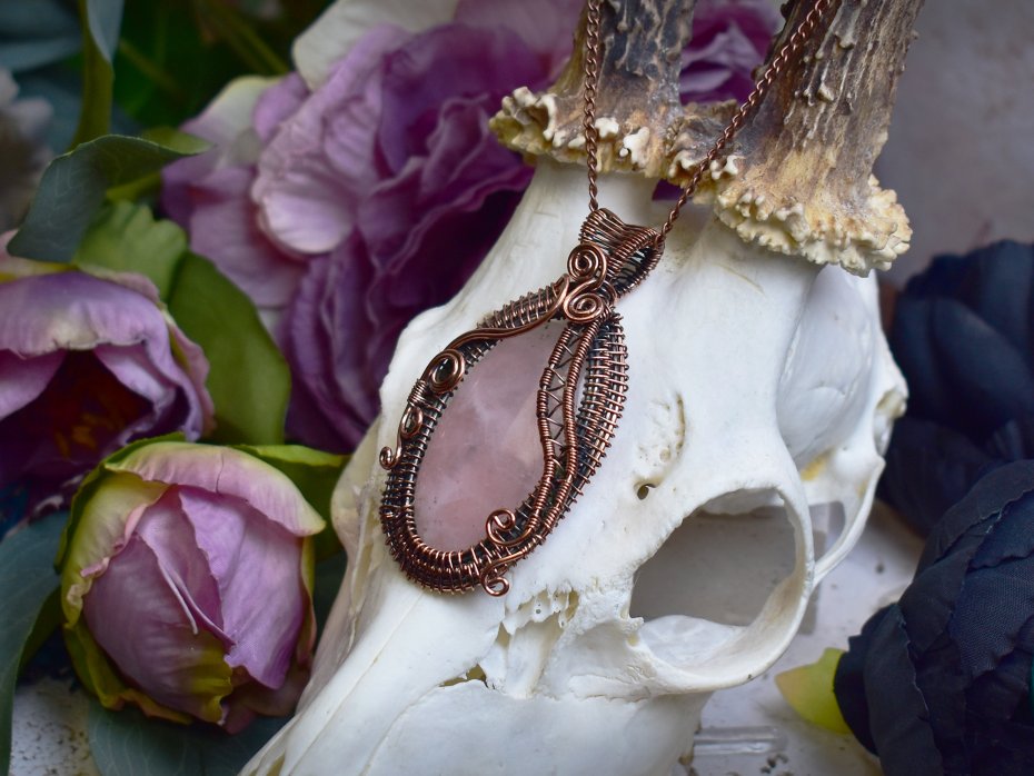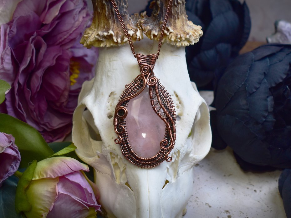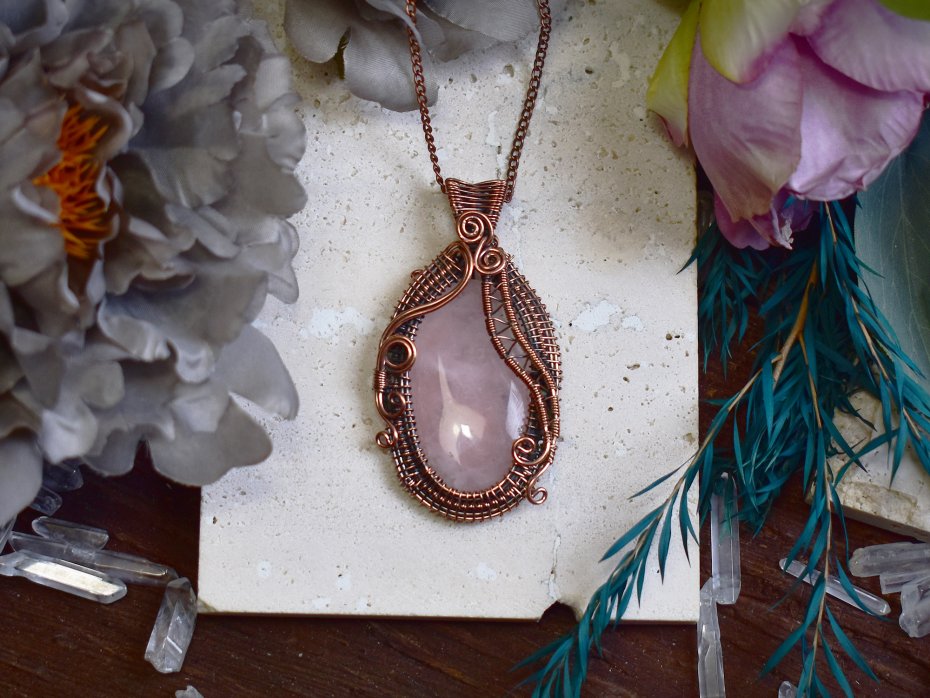 Miedziany wisiorek wykonany techniką wire wrapping, ozdobiony różowym kwarcem o delikatnej, subtelnej barwie. Ręcznie formowane oplatanie podkreśla naturalne piękno kamienia i nadaje całości lekkości oraz organicznego charakteru. Różowy kwarc od wieków kojarzony jest z miłością, harmonią i spokojem emocjonalnym, sprzyjając łagodności i wewnętrznej równowadze. Ciepły odcień miedzi pięknie współgra z pastelowym kolorem kamienia, tworząc elegancką i ponadczasową kompozycję. Wisiorek będzie doskonałym wyborem dla osób ceniących rękodzieło, naturalne minerały oraz biżuterię o subtelnym, romantycznym wyrazie.
