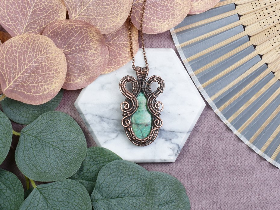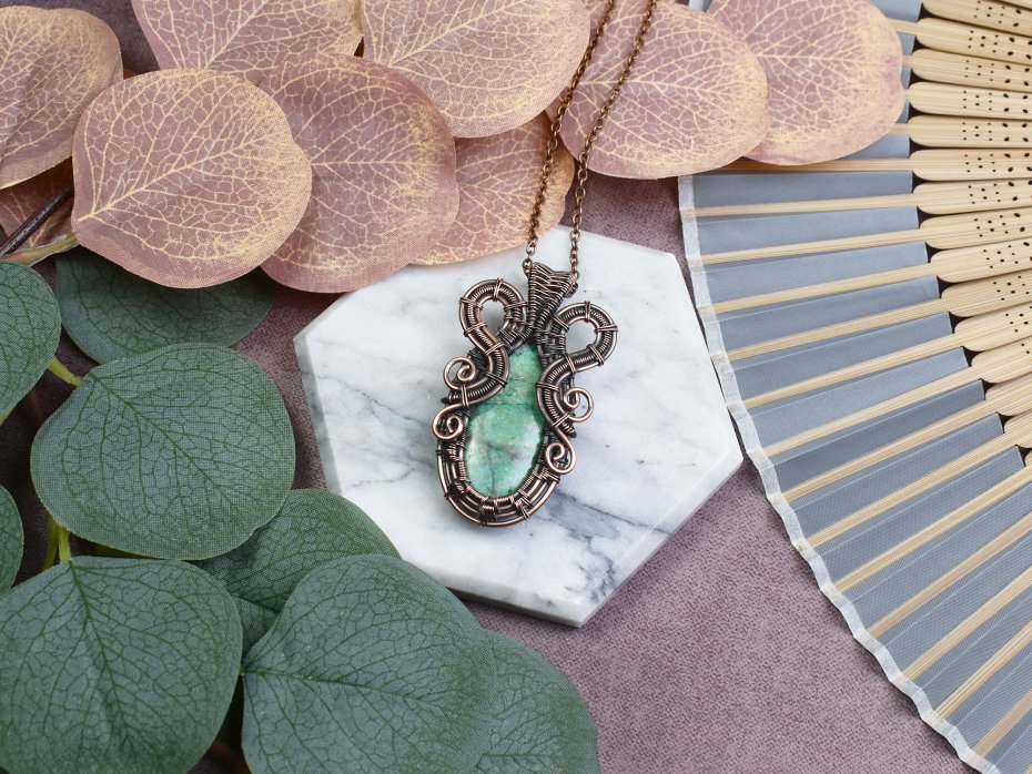Poza tym zajmuję się oprawą kamieni. Używam kamieni naturalnych, kocham labradoryty, ametysty i kwarce. Do oprawy używam miedzi i cyny w technice tiffany oraz miedzi do elektroformowania. Inspiruję się naturą chcąc stworzyć wisiorki i amulety wyglądające jak z gier fantasy :)