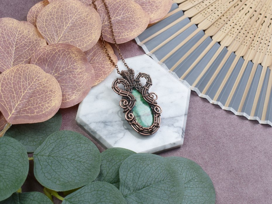 Prosty, a jednocześnie wyjątkowy wisiorek wykonany z miedzi, stworzony techniką wire wrapping z kamieniem o nazwie Szatukit. Ten kamień, znany również jako Szałtajt, emanuje subtelnym pięknem. Umiejętnie owinięty drutem miedzianym, tworzy on minimalistyczny, lecz wyrazisty dodatek. Szatukit, znany ze swoich właściwości ochronnych i stabilizujących, dodaje wisiorkowi znaczenia zarówno w sferze estetyki, jak i energii. To unikalne połączenie metalu i kamienia, które sprawia, że ten wisiorek staje się nie tylko ozdobą, ale także osobistym talizmanem niosącym ze sobą siłę naturalnych elementów.