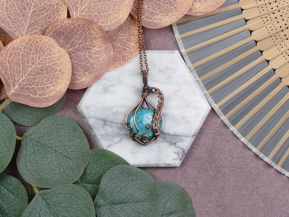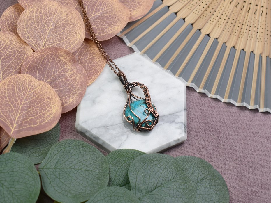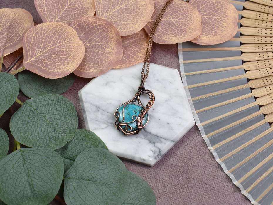 Piękny wisiorek miedziany, wykonany techniką wire wrapping, ozdobiony naturalnym kamieniem - turkusem. Kamień ten emanuje niezwykłą energią, dodając wisiorkowi nie tylko piękna, ale także pozytywnego wpływu na noszącego. Dzięki starannie wykonanym detalom, ten wisiorek jest nie tylko wyjątkowym dodatkiem do Twojej biżuterii, ale również nosi ze sobą głębsze znaczenie natury i harmonii. Idealny sposób, aby dodać odrobinę naturalnego uroku i pozytywnej energii do codziennego stroju.