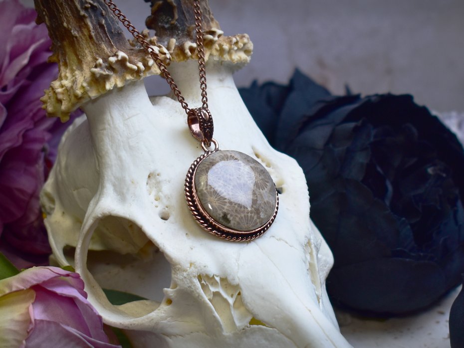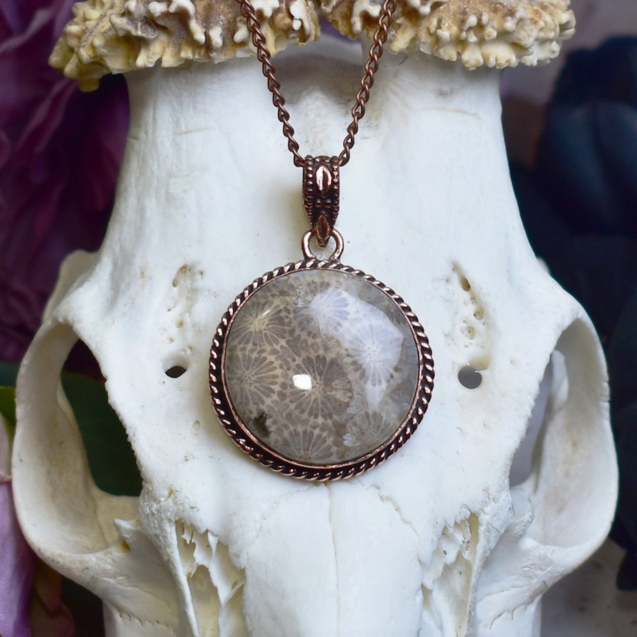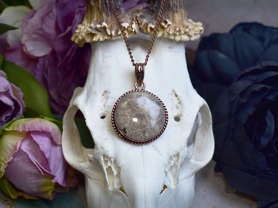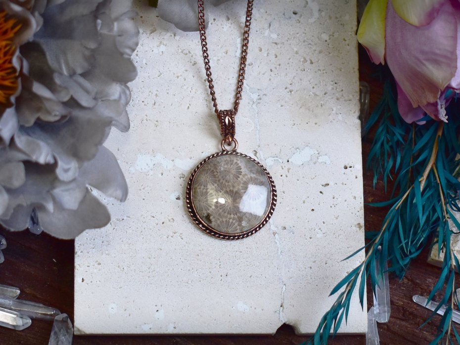 Miedziany wisiorek wykonany tradycyjnymi metodami rzemieślniczymi, ozdobiony skamieniałym koralowcem – kamieniem o niezwykłej strukturze i unikatowym, naturalnym wzorze. Skamielina koralowca przyciąga uwagę subtelnymi odcieniami beżu, brązu i kremu, które harmonijnie współgrają z ciepłym kolorem miedzi. Kamień ten kojarzony jest z historią Ziemi, trwałością i stabilnością, a jego organiczna forma nadaje wisiorkowi niepowtarzalny charakter. Połączenie ręcznie wykonanej, klasycznej formy z naturalnym pięknem skamieliny tworzy elegancki, ponadczasowy projekt, idealny dla osób ceniących biżuterię artystyczną, unikatowe minerały oraz symboliczne znaczenie kamieni.