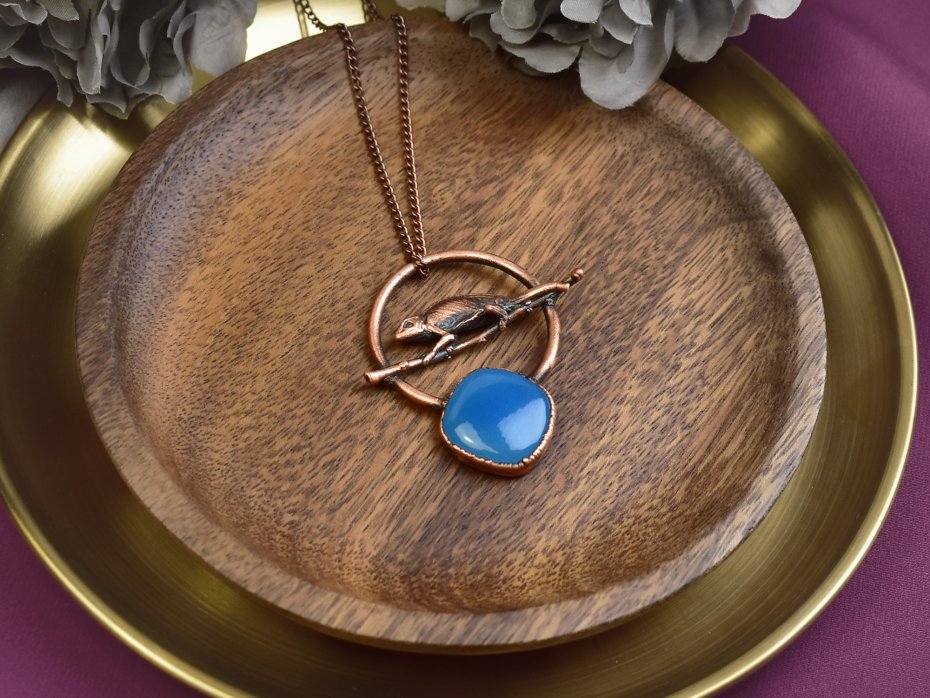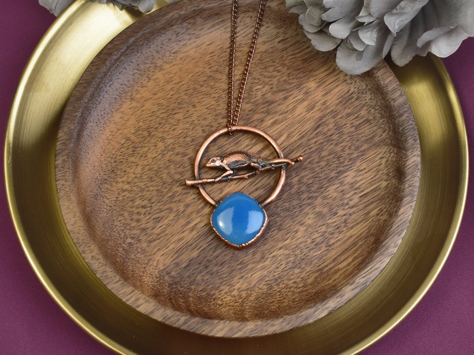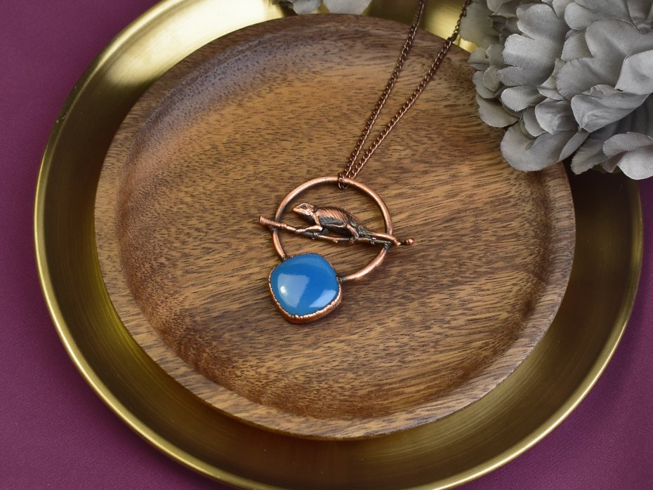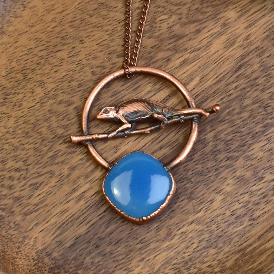 Ręcznie wykonany wisior z chalcedonem ozdobiony figurką kameleona. Oprawa wykonana z miedzi metodą elektroformowania, patynowana.
