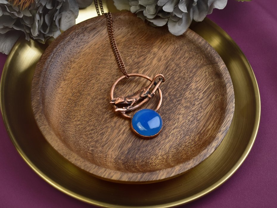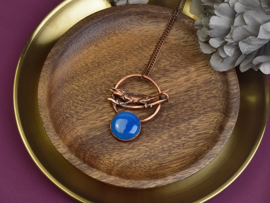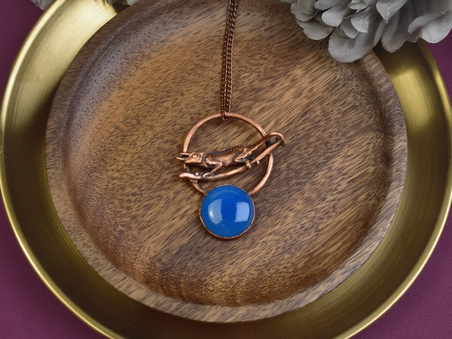 Ręcznie wykonany wisior z chalcedonem ozdobiony figurką kameleona. Oprawa wykonana z miedzi metodą elektroformowania, patynowana.