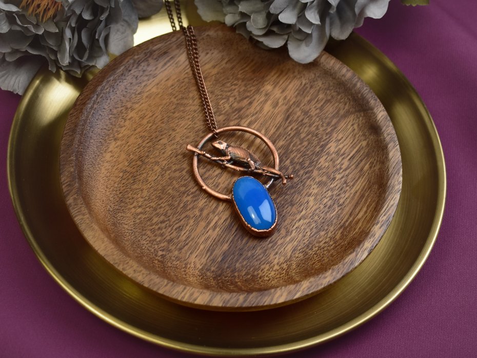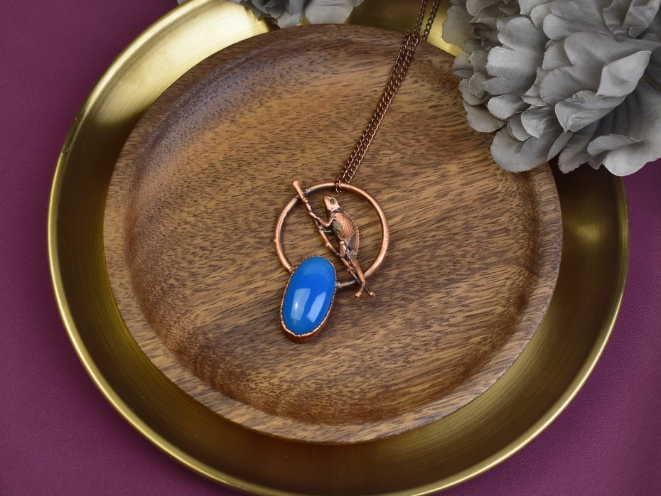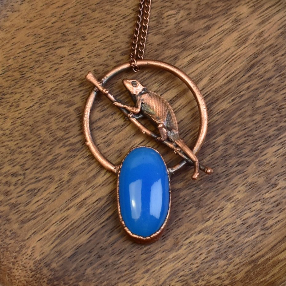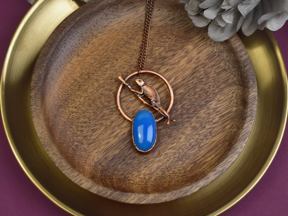 Ręcznie wykonany wisior z chalcedonem ozdobiony figurką kameleona. Oprawa wykonana z miedzi metodą elektroformowania, patynowana.