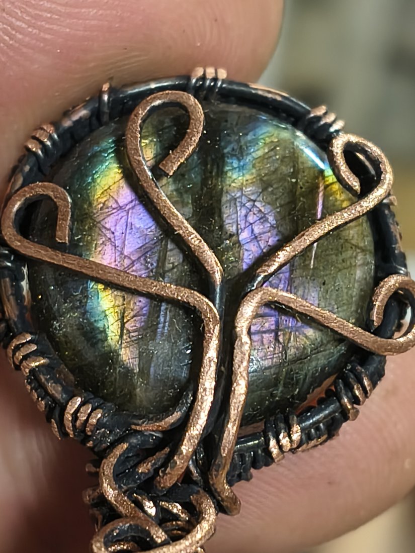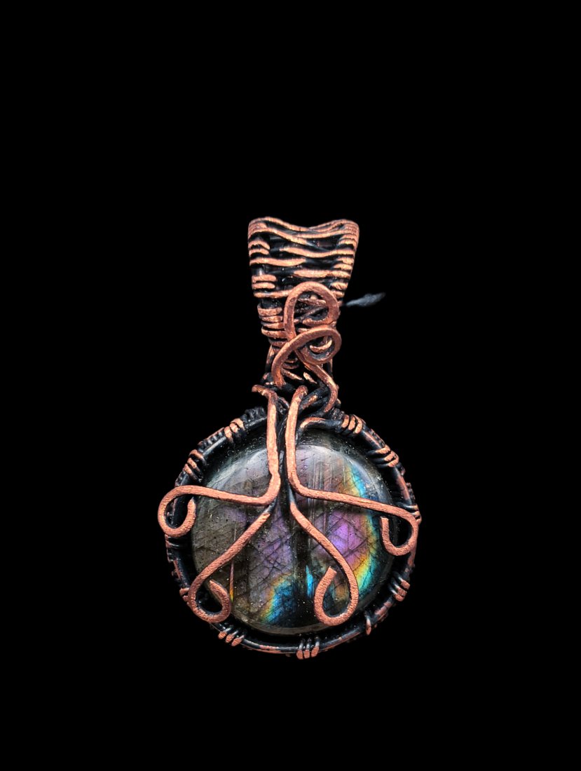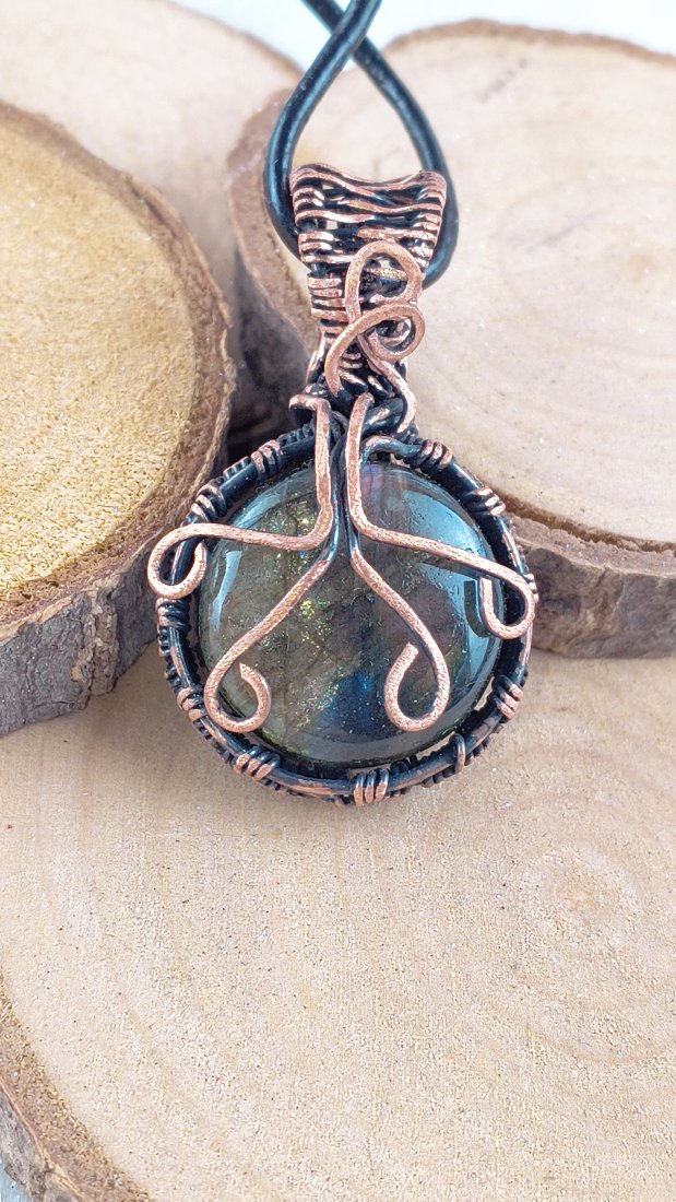 Miedziany wisiorek oksydowany z labradorytem wykonany Techniką ground wire wrapping