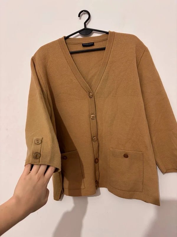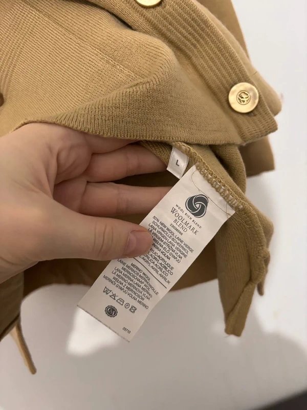 Miękki, ciepły kardigan w kolorze camelowym z wysokiej jakości mieszanki wełny certyfikowanej Woolmark. Model zapinany na guziki, z dwiema kieszeniami i ozdobnymi guzikami na rękawach. Idealny na jesień i zimę — bardzo przyjemny w dotyku, nie gryzie. Klasyczny, minimalistyczny fason, pasuje do eleganckich i codziennych stylizacji.