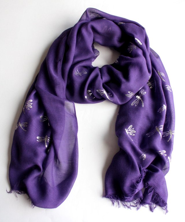 Miękki, miły w dotyku szal w głębokim odcieniu fioletu, ozdobiony ważkami w dyskretnym kolorze srebrnym.