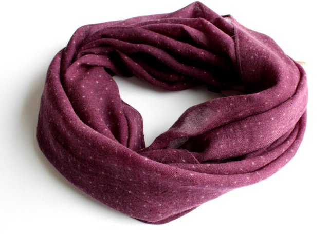 Miękki, duży szal w ciemnym śliwkowym odcieniu z nutą bordo w beżowe groszki.