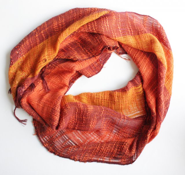 Miękki szal w ognistych kolorach wykonany z tkaniny o luźnych, miękkich splotach. Materiał to prawdopodobnie wiskoza.