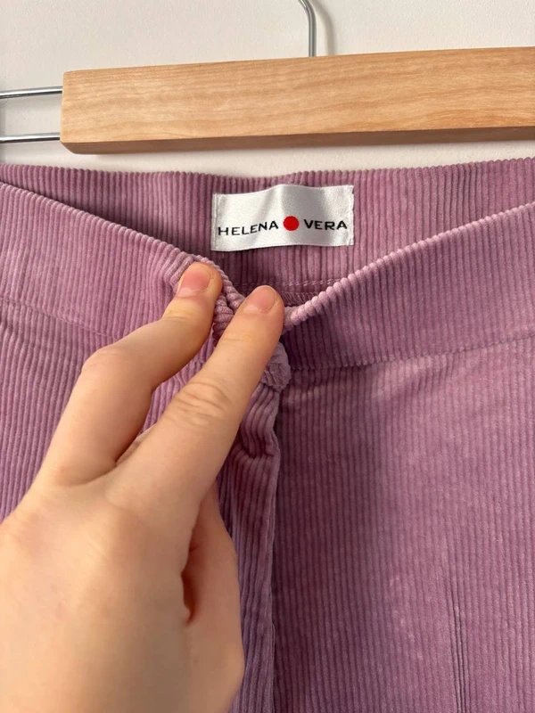 Delikatny, szeroki sztruks o naturalnym połysku — tkanina grubsza, ale miękka i przyjemna w dotyku.
