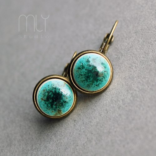 Okrągłe ceramiczne kolczyki, ręcznie wykonane z delikatnej jasnobeżowej gliny kamionkowej, szkliwione mieszanką zielonych szkliw z efektem plamek, na zamkniętych biglach w kolorze starego złota. Średnica elementu ceramicznego ok. 12mm, długość bigla ok 19mm. Istnieje możliwość wykonania pasującego pierścionka lub kolczyków w formie sztyftów Polecam