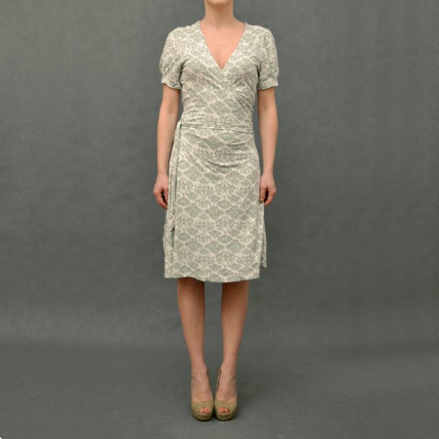 Kopertowa sukienka w miętowe wzory. Bardzo wygodny i przyjemny materiał. Marka POPIN.