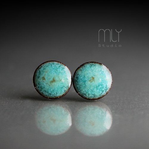 Okrągłe, lekko nieregularne ceramiczne kolczyki w formie sztyftów, ręcznie wykonane z delikatnej gliny kamionkowej, jednostronnie szkliwione mieszanką zielonych szkliw z efektem plamek i subtelnym połyskiem, na sztyftach w kolorze srebrnym. Średnica ok. 9mm.Polecam