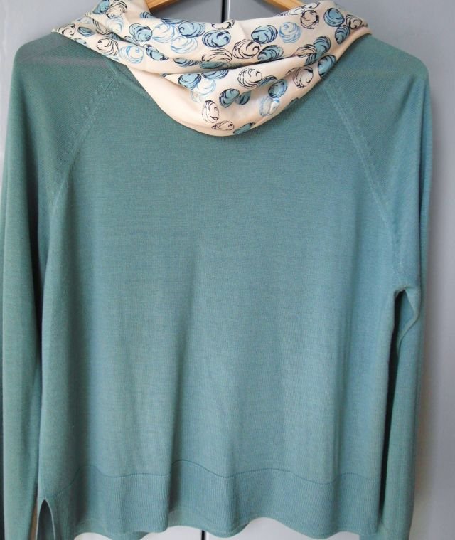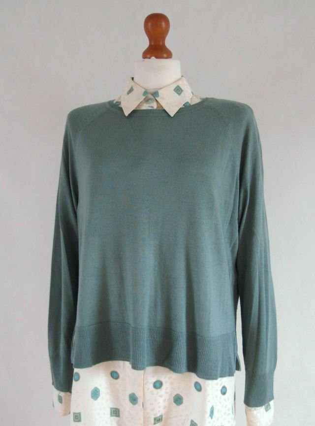 piękny kolor -miętowo szałwiowy.Fason szerszy, z rozcięciami na bokach.Bardzo przyjemny w dotyku.