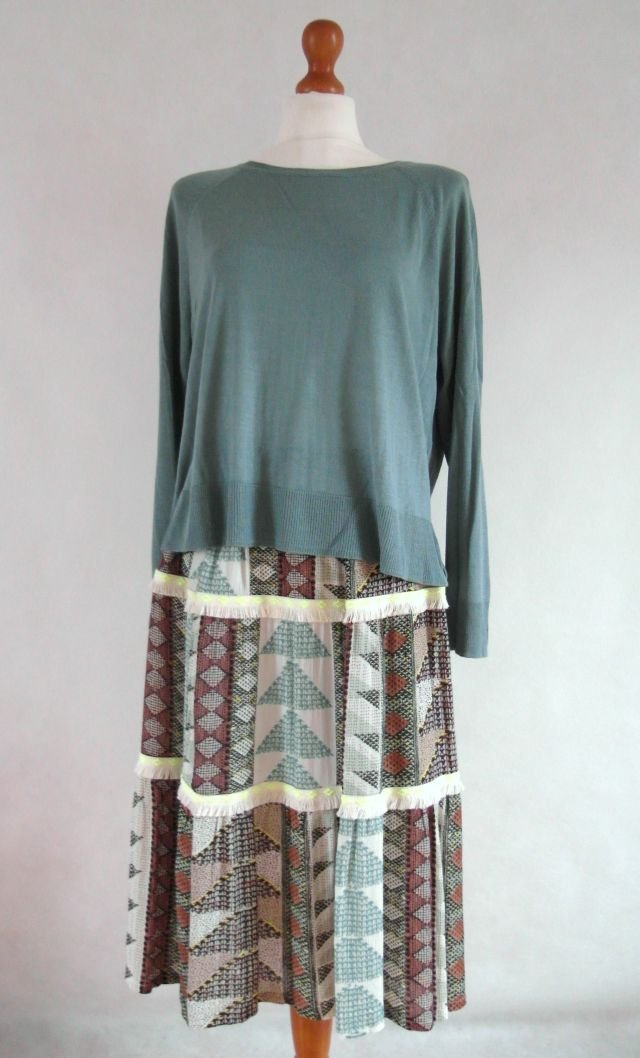 piękny kolor -miętowo szałwiowy.Fason szerszy, z rozcięciami na bokach.Bardzo przyjemny w dotyku.