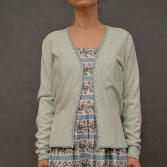 Mięciutki, miętowy sweterek marki GEORGE. Wykończony pięknie koralikami. Zapinany na jeden zdobiony guziczek. Polecam.