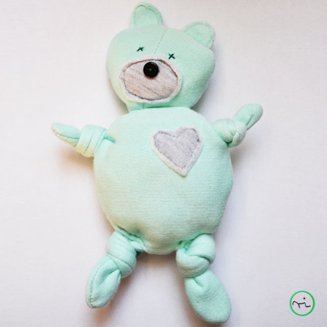 Miś wykonany został z dzianiny dresowej w kolorze mięty. Mięciutka przytulanka dla najmłodszych. Miś mierzy ok. 20 cm