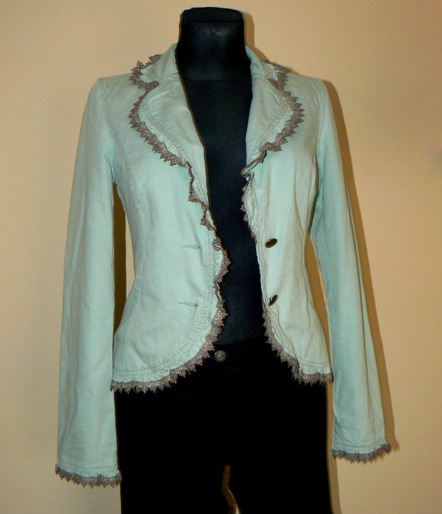 Miętowa marynarka Vila zapinana na dwa metalowe guziki, zdobiona koronkową taśmą.