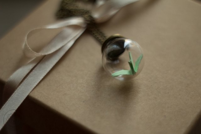 Delikatny, maleńki, papierowy żuraw - japoński symbol szczęścia, zdrowia i pokoju. Podobno, jeśli w jakiejś intencji złoży się tysiąc żurawich figurek, to życzenie się spełni. My spełniamy życzenia tym zjawiskowym wisiorkiem. Papierowy żuraw ukryty w szklanej kuleczce o najszerszej średnicy 2 cm. Część ozdobna zawieszona na łańcuszku o max. długości 37 cm. Całość w kolorze starego złota/brązu.