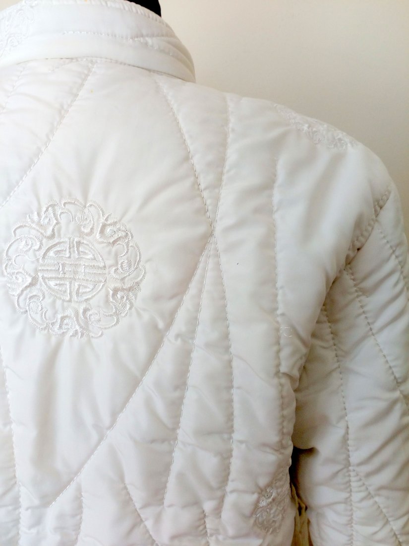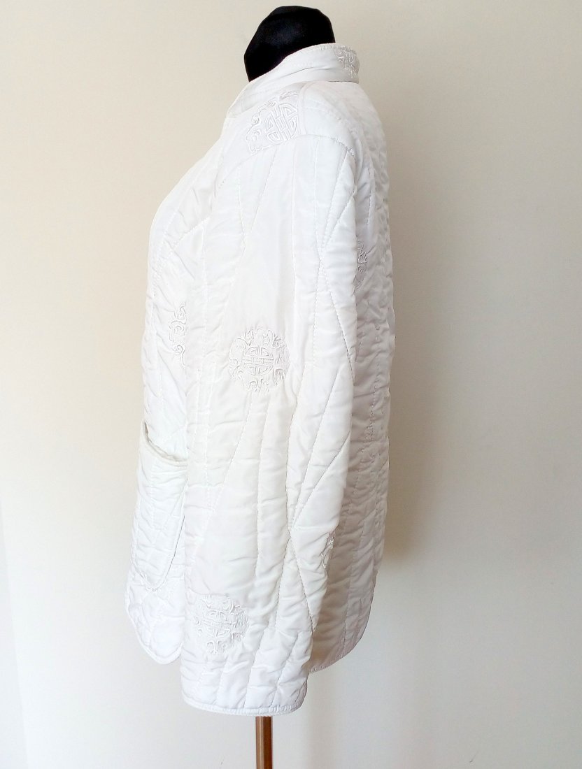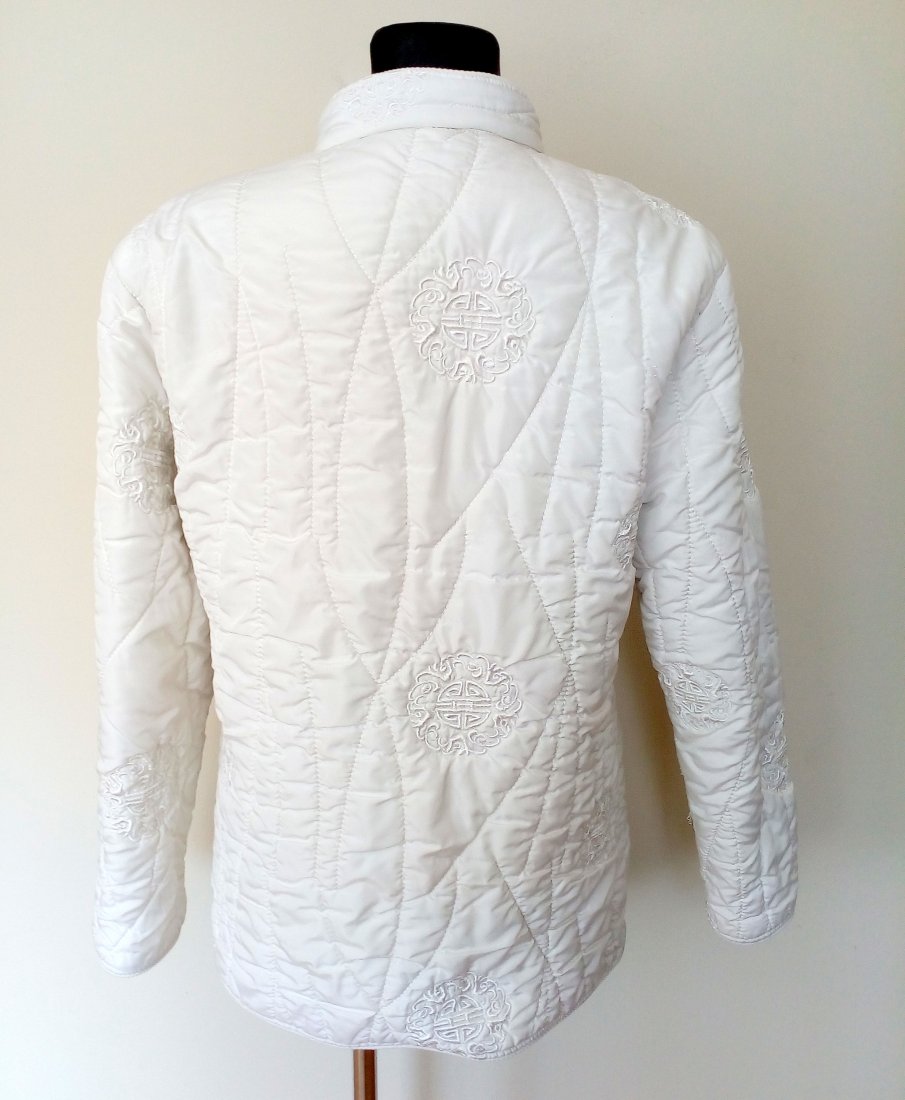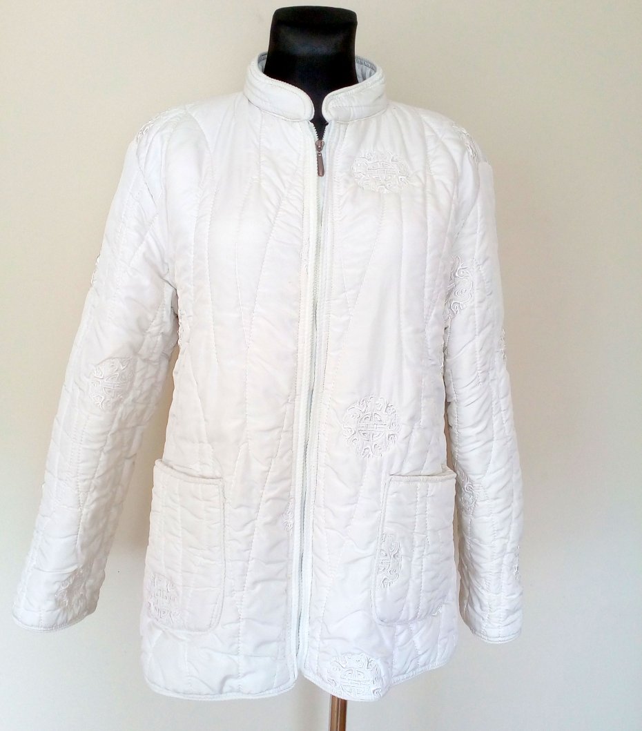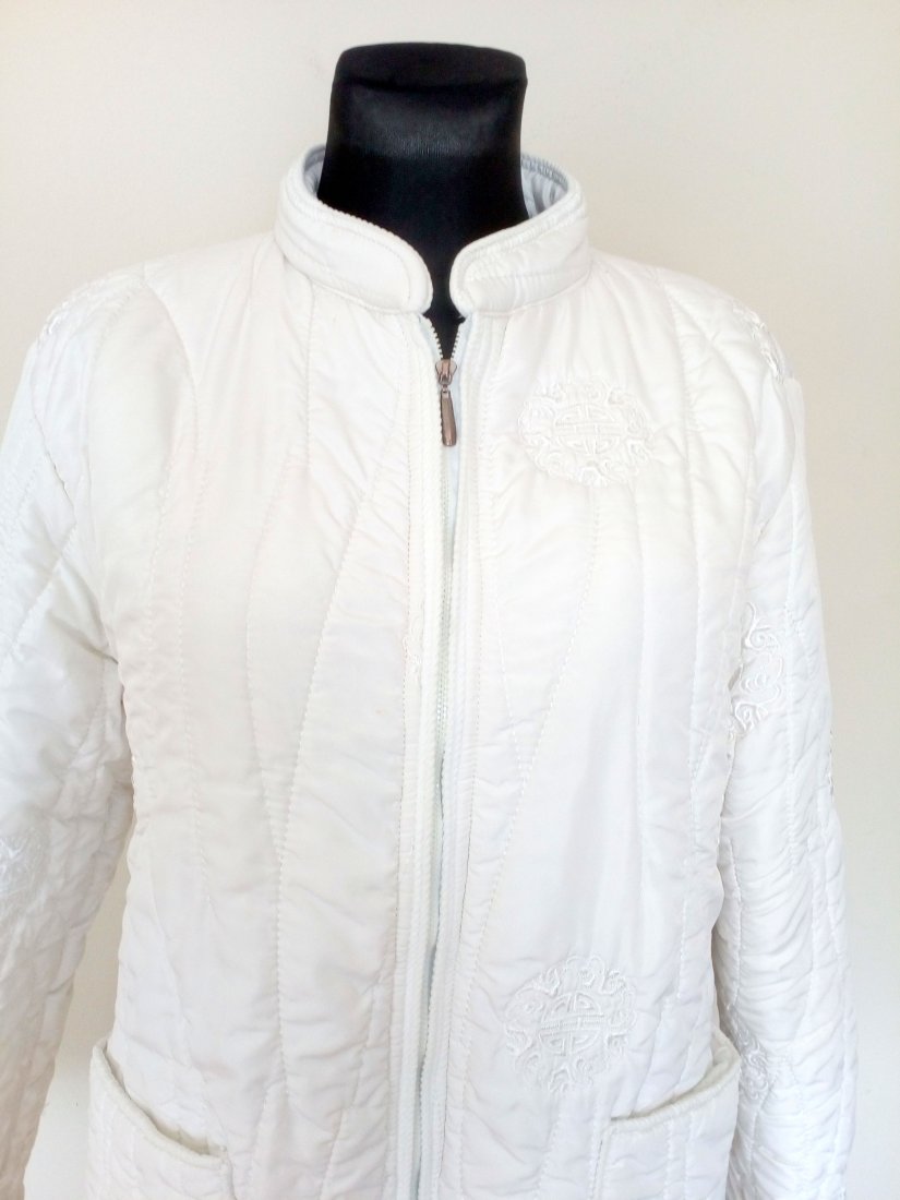 Pikowana, lekka kurtka z haftowanymi motywami, kolor biały, wokół szyi stójka, zapinana na plastikowy zamek, z przodu naszywane kieszenie, u dołu po bokach rozcinana