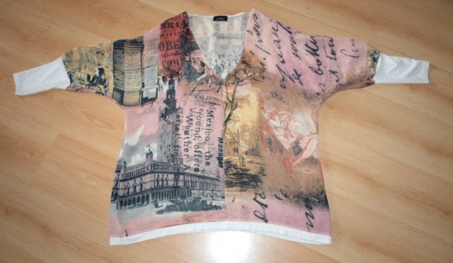 Oversizowa tunika skandynawskiej marki milieu. Materiał 100% wiskoza. Niezwykle oryginalny nadruk. część rękawów z kremowej dzianiny. Bardzo duży dekolt, polecam do noszenia z topem pod spodem. Rozmiar z metki L. na manekinie o rozmiarze 38. Polecam dla większych rozmiarów 42-44. stan bardzo dobry.