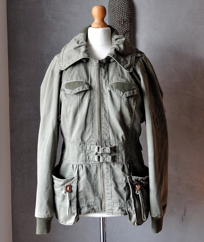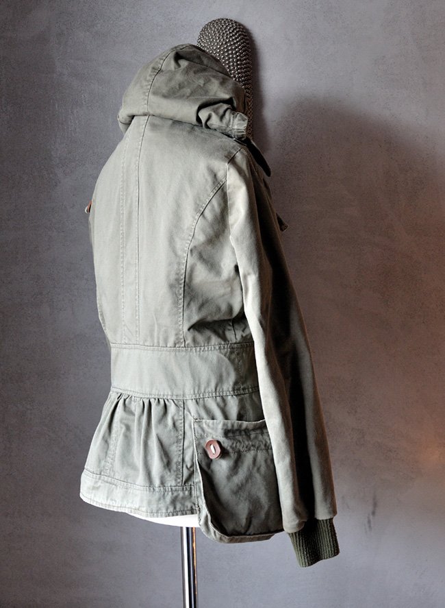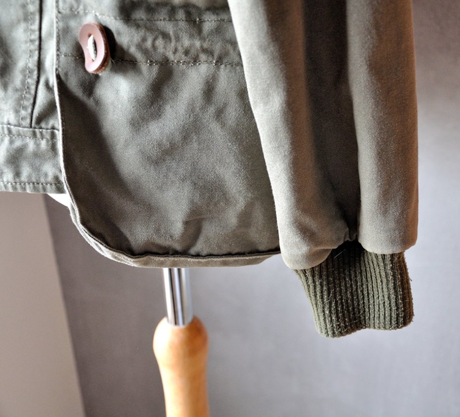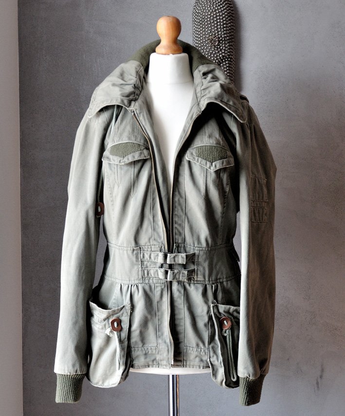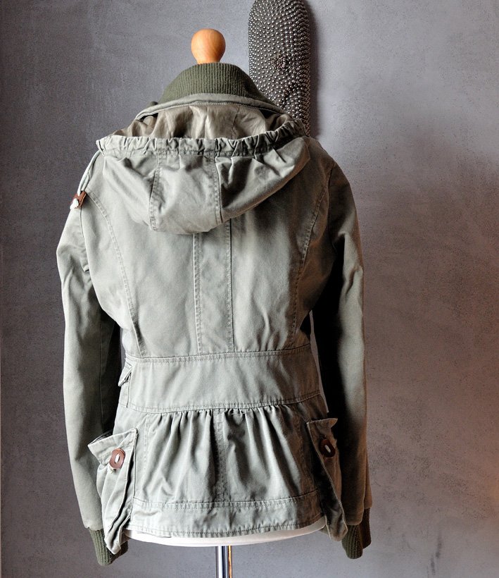 Uszyta z grubej, sztywniejszej tkaniny bawełnianej w odcieniu wojskowej zieleni. Nie jest ocieplana - a cieplejszą jesień lub wiosnę.