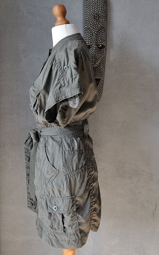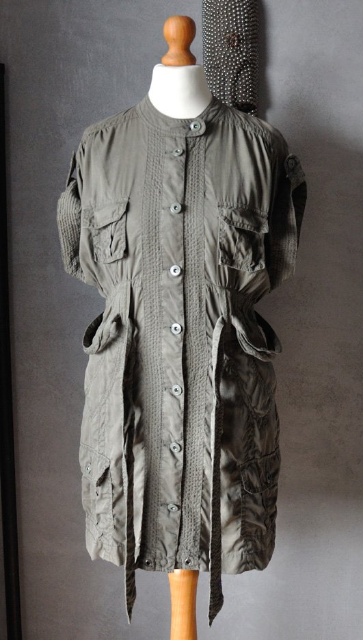 W tym projekcie dzieje się bardzo dużo, ale wygląda to rewelacyjnie! Cała ozdobiona przeszyciami, góra luźna, kimonowa. Zapinana na metalowe (pokryte zieloną emalią) guziki pod szyję, ze stójką. Materiał miękki i przyjemny w noszeniu. Na rękawach paski i guziki, którymi można te rękawy przypiąć, tworząc pagony. Materiał przymarszczono na ramionach.
