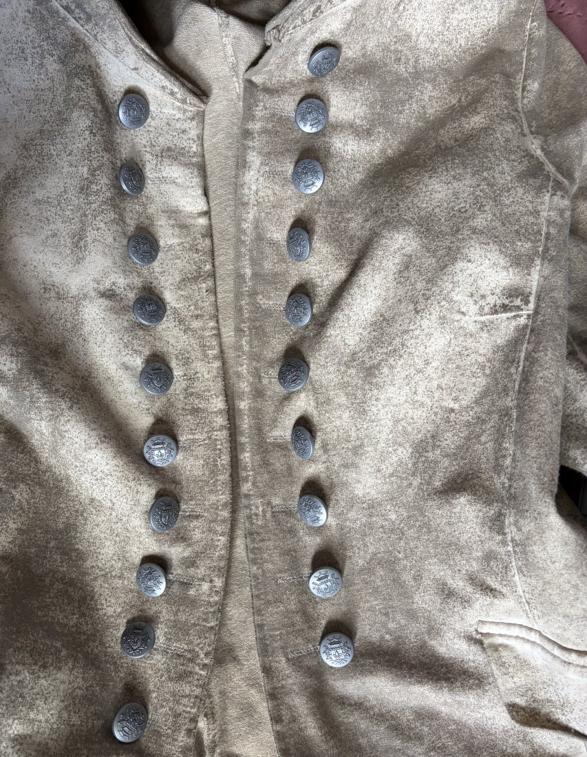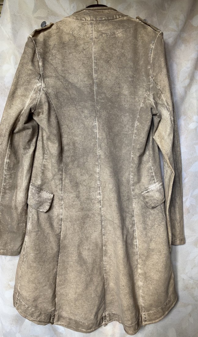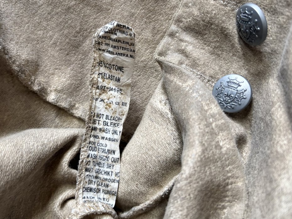 Military style - oryginalny stylowy żakiet .PERLA NERA ( utożsamiana z marką : Made in Italy ) Fason nieco mundurowy , nieco surdutowy . 95 % cotton 5 % elastan . Nie zapinany , z pagonami , 22 metalowe guziki , kieszenie . Lekko taliowany , asymetryczny, miękko na dole wykończony, oliwkowa zieleń i charakterystyczne dla włoskich wyrobów barwienie . Ramiona 37 pachy 48 długość rękawa od ramienia 66 długość przodu 74 długość tyłu 91 szerokość na dole 63 cm średnica guzika 2 cm Mierzone na płasko . Stan zachowania : bardzo dobry - drobne ślady użytkowania - bez większych wad. Metka firmowa i metka ze składem obecne
