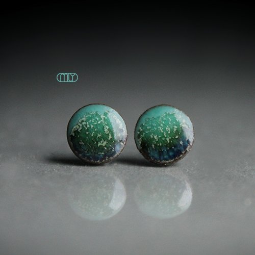 Ceramiczne okrągłe kolczyki w formie sztyftów, ręcznie wykonane z delikatnej gliny kamionkowej, jednostronnie szkliwione mieszanką błyszczących błękitnozielonych szkliw z efektem plamek i drobinek, na sztyftach w kolorze srebrnym. Średnica ok.6mm. Polecam