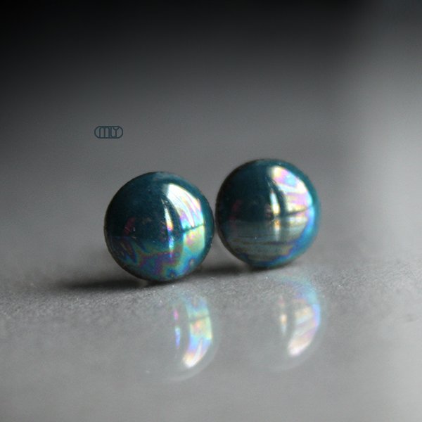 Ceramiczne okrągłe kolczyki w formie sztyftów, ręcznie wykonane z delikatnej gliny kamionkowej jednostronnie szkliwione zielonym szkliwem z efektem plamek i pięknym lustrzanym połyskiem, na antyalergicznych sztyftach w kolorze srebrnym. Średnica ok. 6mm. Polecam