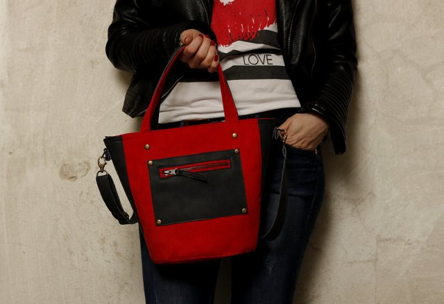 Oryginalna torebka wykonana z zamszu alcantara w kolorze czerwonym i grafitowej lekko przecieranej ekoskóry .Materiał jest bardzo trwały i miły w dotyku.